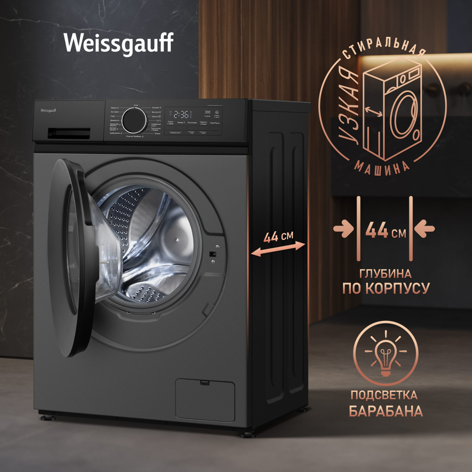 Отдельностоящая стиральная машина Weissgauff, имеющая достойные показатели загрузки до 8 кг белья и скорости отжима до 1200 оборотов в минуту, а также большой цифровой дисплей с наглядной индикацией для выбора специальных возможностей и программирования установок - это настоящее сочетание отличного качества и разумной цены!