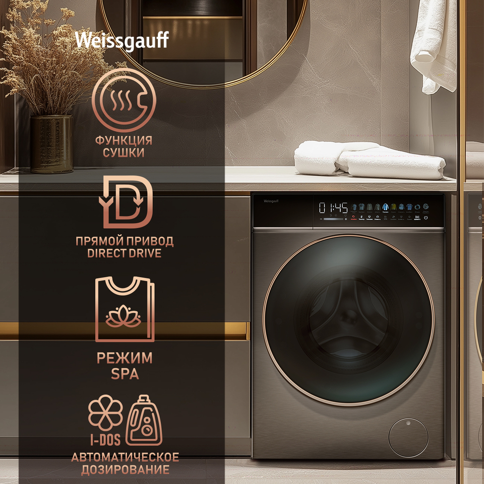 Отдельностоящая стиральная машина Weissgauff с функцией сушки, выполненная в цвете "серебристый металлик", оснащенная прямым приводом, инверторным двигателем и функцией пара, имеющая показатели загрузки до 11 кг белья при стирке и до 6 кг белья при сушке, скорость отжима до 1400 оборотов в минуту, а также цветной дисплей SMART SCREEN, функции автодозирования и озонирования - это одна из наиболее передовых моделей Weissgauff в категории стиральных машин!