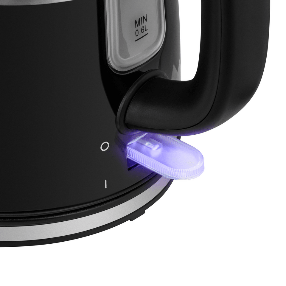 На ручке предусмотрена хромированная кнопка автоматического открывания. Окошко с индикатором уровня воды находится непосредственно на корпусе чайника. Кнопка включения/выключения с голубой подсветкой располагается под ручкой В носике крепится съемный фильтр, который легко достается и моется.