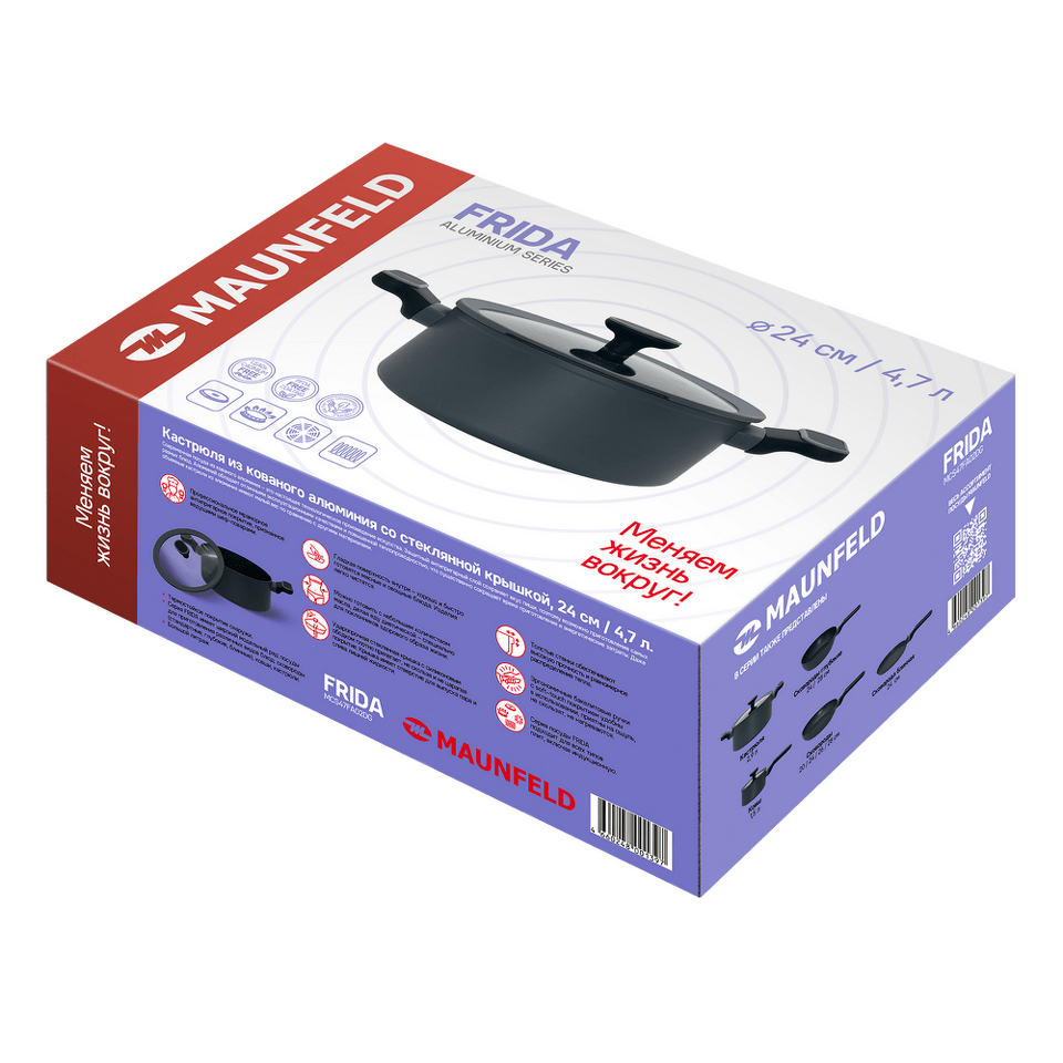 Кастрюля идет в комплектации со стеклянной жаропрочной крышкой. Бакелитовая ручка.
