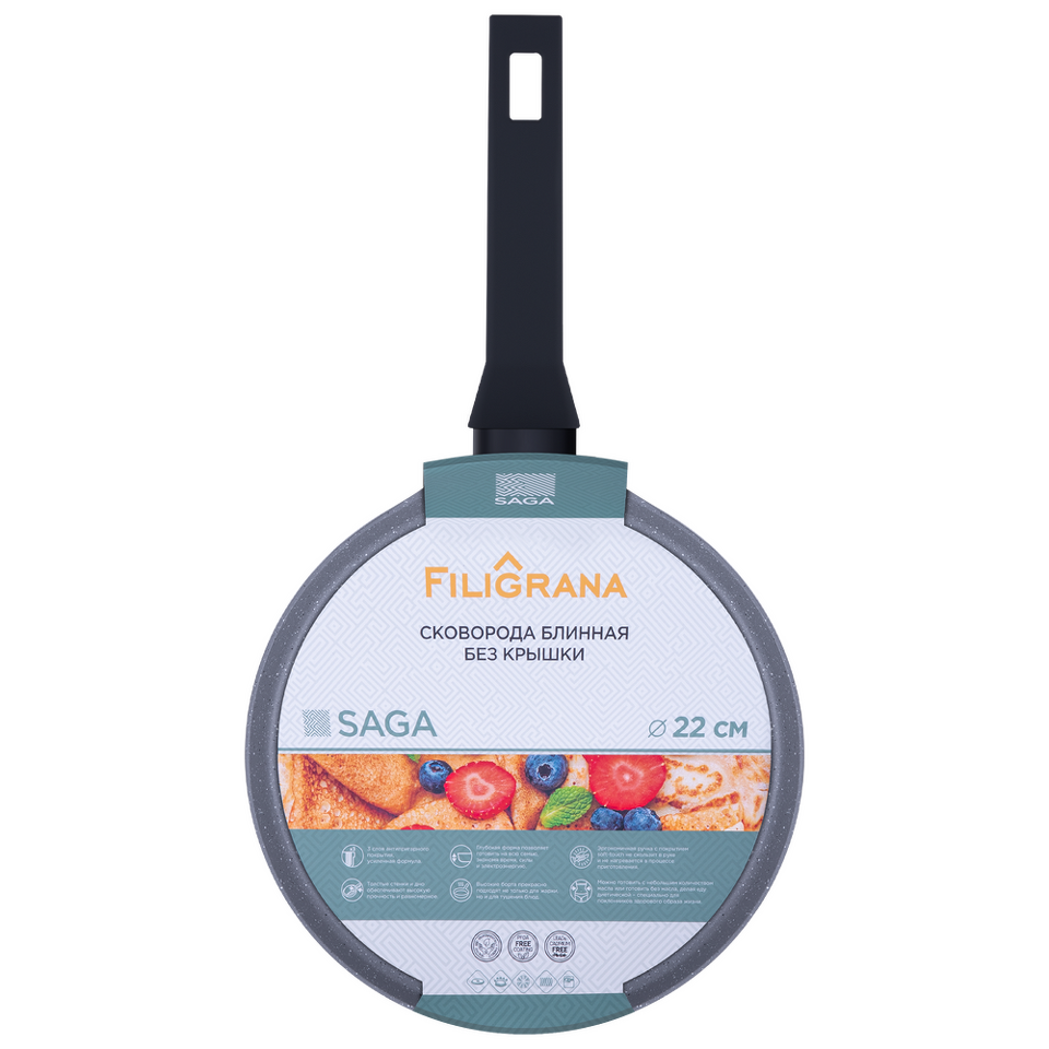 Блинная сковорода FILIGRANA серии SAGA изготовлена из кованого алюминия, толстые стенки и дно обеспечивают высокую прочность и равномерное распределение тепла.