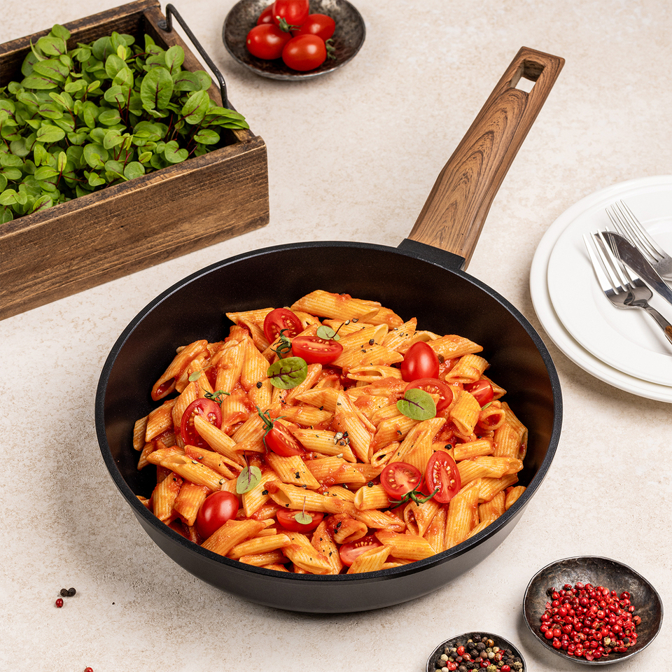 Элегантная сковорода в классическом черном цвете и ручкой из бакелита с отделкой под дерево, подойдет под любой интерьер кухни. Современные и стильные формы- мы учли все мировые тенденции, чтобы посуда была 100% экологичной и стильной.