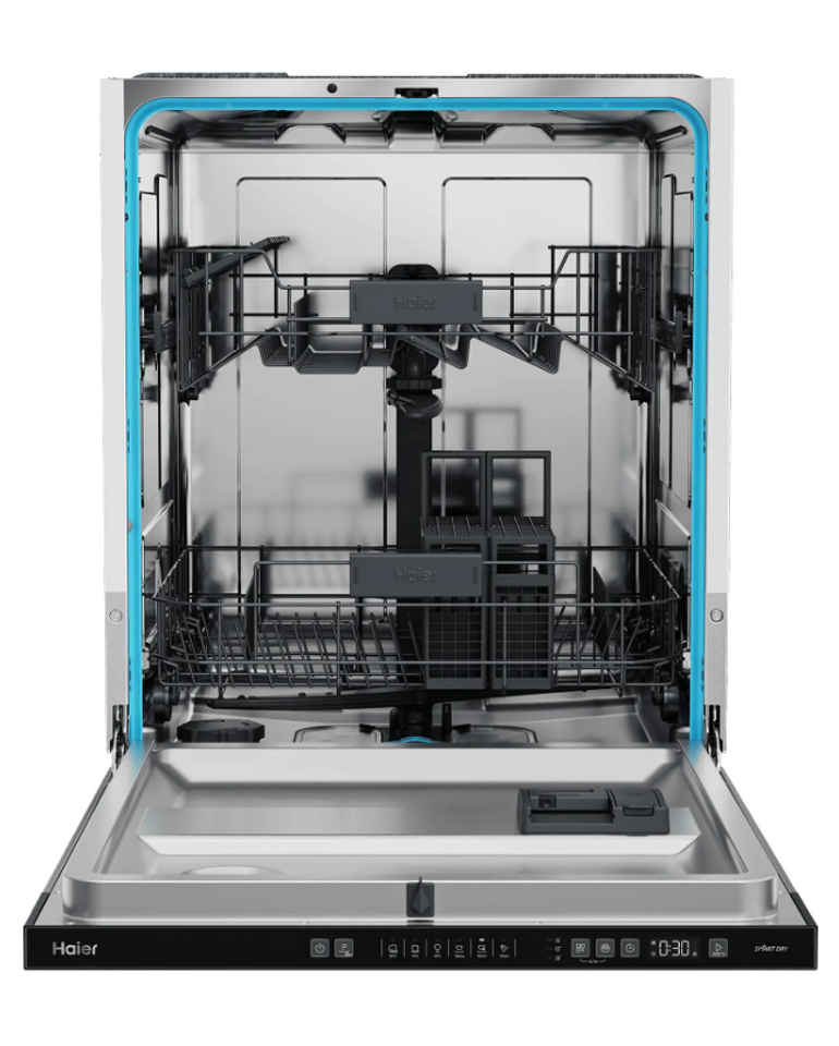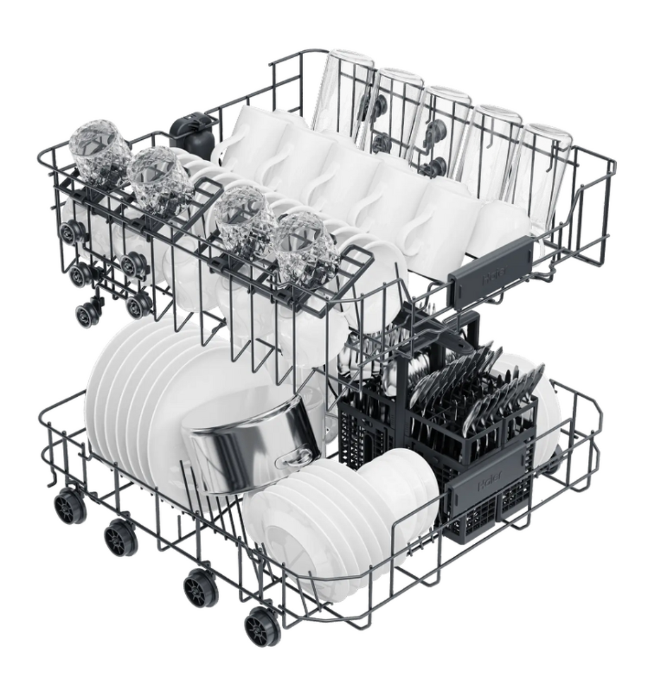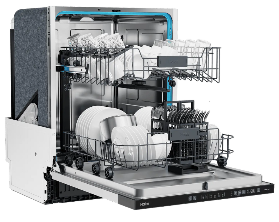 Встраиваемая посудомоечная машина шириной 60 см HDWE14-592RU рассчитана на загрузку до 14 стандартных комплектов посуды, такая большая вместимость поможет помыть за один цикл всю посуду практически в любой жизненной ситуации, причем в нижней и средней корзине есть складные держатели для тарелок. В нижней корзине есть складные держатели для тарелок, а верхнюю корзину можно отрегулировать по высоте, чтобы максимально удобно загрузить всю посуду. Важная особенность этой модели — автоматическое открывание двери в конце программы мойки. Так посуда высохнет более быстро и качественно без дополнительного расхода электроэнергии.