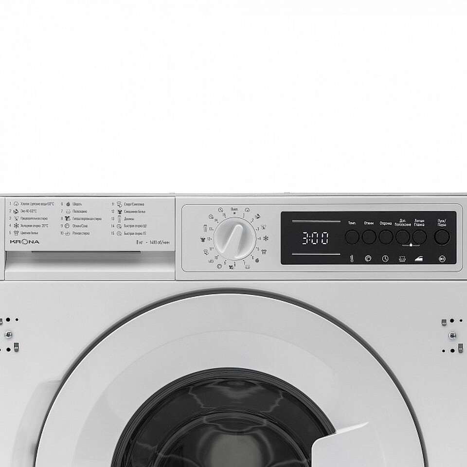 Встраиваемая стиральная машина KALISA объемом загрузки 8 кг оснащена 15 программами стирки для разных типов белья. Модель предусматривает настройку скорости отжима до 1400 об/мин, а также регулировку температур стирки в диапазоне 20-90 °С. Для вашего удобства в модели предусмотрена функция паузы, отложенный старт на 1-24 часа, дополнительное полоскание и режим легкой глажки. Безопасность пользователя обеспечивают такие функции как: блокировка управления от детей, электронная защита от перелива и протечек, контроль пенообразования. Стиральная машина KALISA отличается высоким классом энергоэффективности А+++, благодаря которому годовое потребление электроэнергии составляет всего 194 кВт.