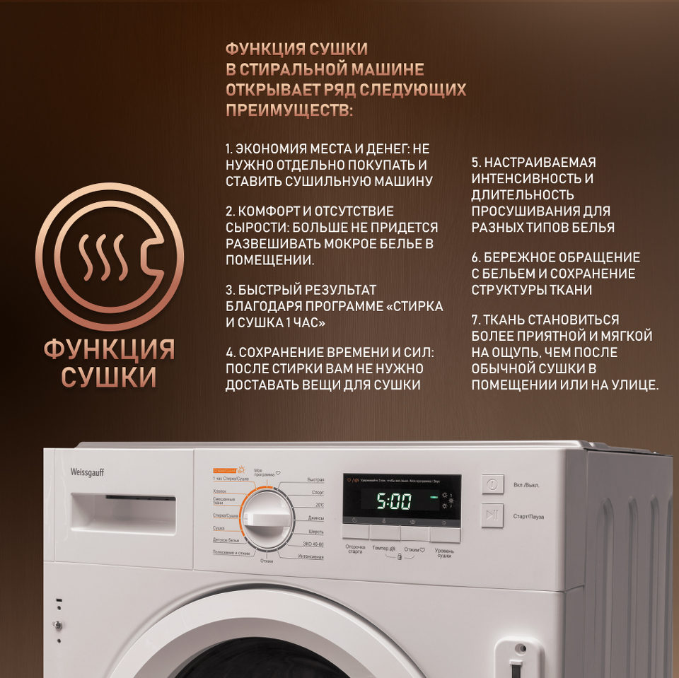Быстрый режим Стирка + Сушка за 1 час - подходит для ситуаций, когда вам за короткое время необходимо получить чистые и сухие вещи!