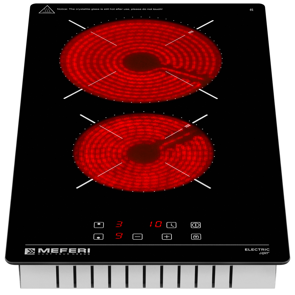 Две Электрические Конфорки: Несмотря на свой компактный размер, Meferi MEH302BK LIGHT оборудована двумя электрическими конфорками, что позволяет вам приготовить два блюда одновременно.