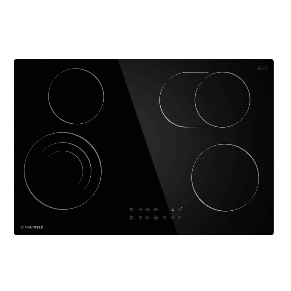 Стильная электрическая встраиваемая варочная панель шириной 77 см выполнена из ударопрочной стеклокерамики черного цвета. Благодаря идеальной гладкости и высокой износостойкости она легко очищается.