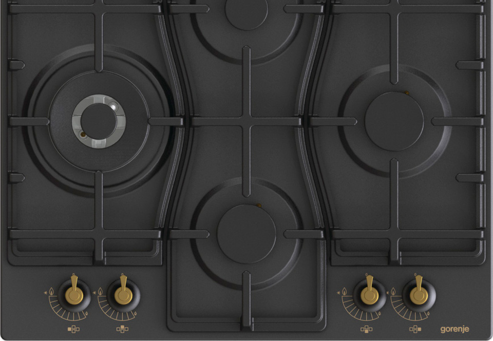 Независимая газовая варочная панель Gorenje GW6D42CLB — модель черного цвета из коллекции Classico. Ромбовидное расположение конфорок необычно, но очень удобно, так как источники огня расположены вдали от элементов управления. Электрический поджиг позволяет включать газ поворотом регулятора.