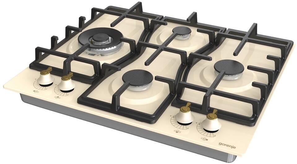 Варочная панель Gorenje GW6D42CLI выполнена в цвете слоновой кости и бронзы с добавлением чёрного. Им служат чугунные решётки. Они имеют затейливую форму, но при этом идеально гладкие, поэтому надёжно удержат всю кухонную утварь. Кроме того, они не деформируются от воздействия огня. Безопасность играет для фирмы немалую роль, поэтому в поворотные регуляторы встроена система автоматического электроподжига. Так вы избежите взаимодействия с открытым пламенем. Если вдруг оно потухнет, то в течение 5 секунд сработает система газ-контроля. Она перекроет подачу газа к конфорке. Так вы избежите утечки и отравления.