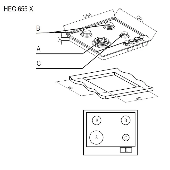 Для установки варочной поверхности необходима рабочая поверхность толщиной не менее 30 мм, в которой производится вырез по размерам согласно схеме встраивания. Поверхность встраивания должна выдерживать 100 °C. По периметру выреза необходимо установить специальный уплотнитель, который идет в комплекте. У каждой конфорки есть электроподжиг и газ-контроль. Следует ухаживать за варочной поверхностью от загрязнений и при необходимости очищать жесткой щеткой датчик газ-контроля от образования нагара. Необходимо использовать посуду, подходящую по размерам к каждой конфорке. Края посуды не должны выходить более чем на 2 см за зону приготовления.