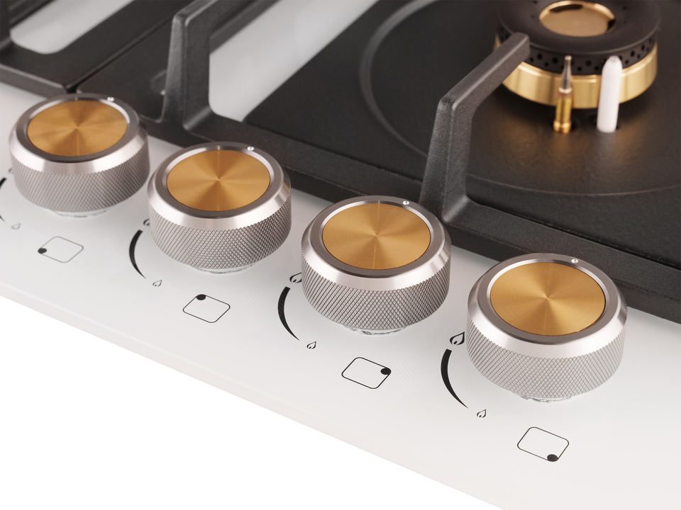 Автоматический электроподжиг, независимо встроенный в каждую из рукояток, позволит зажечь любую конфорку за долю секунды, всего одним нажатием и поворотом руки, не прибегая к дополнительным приспособлениям!