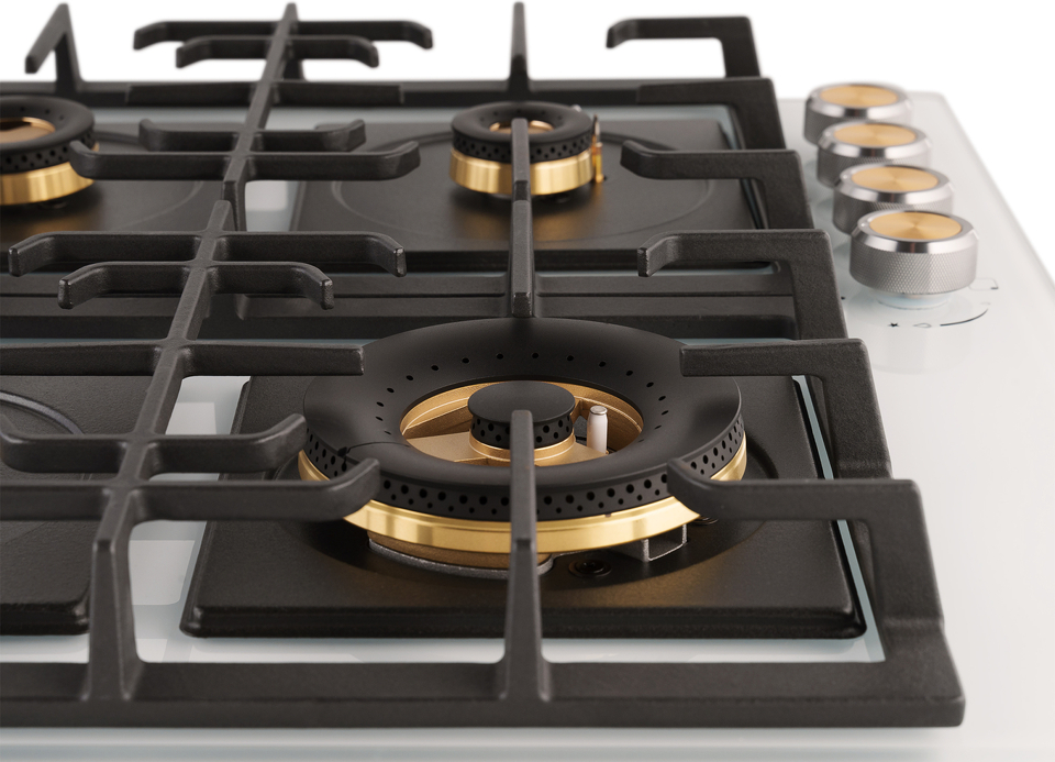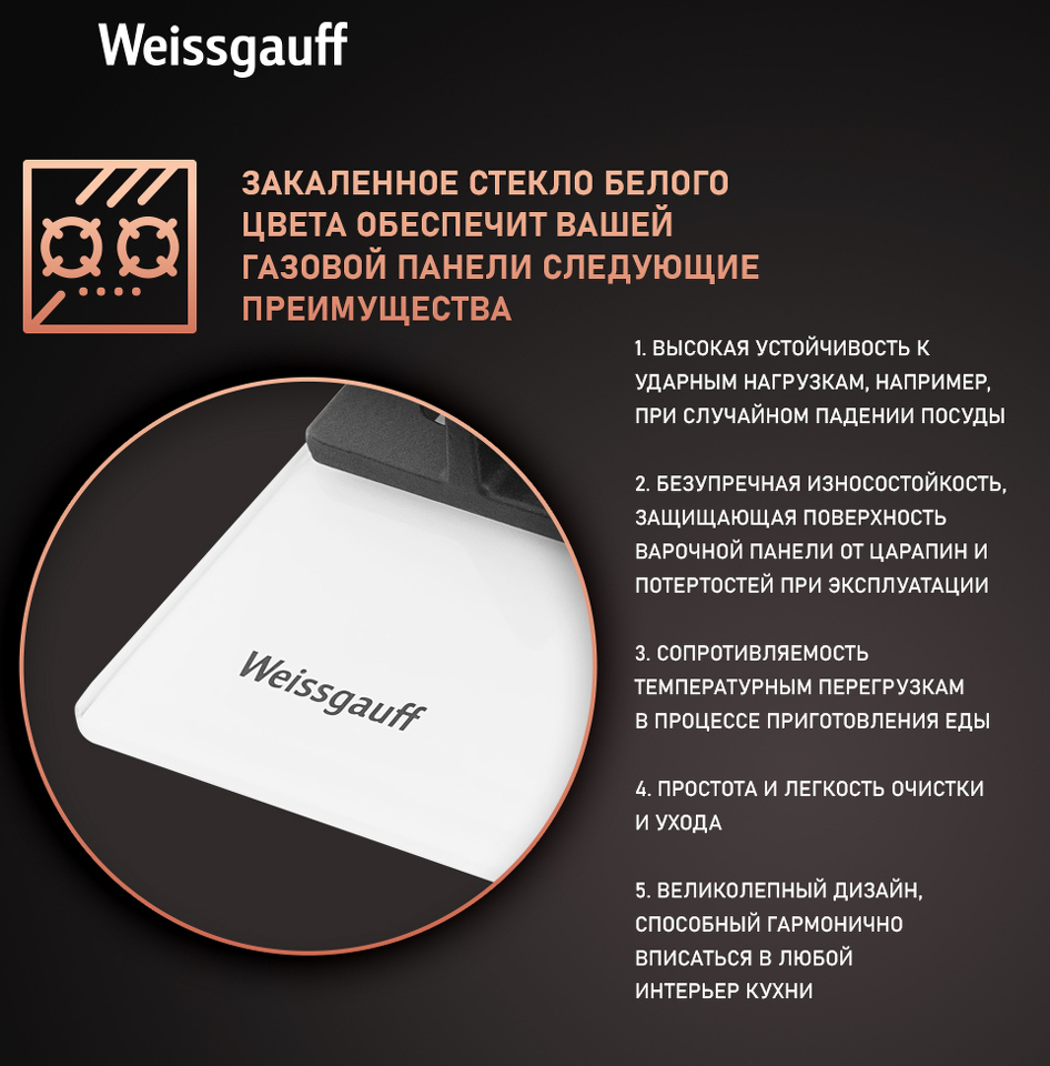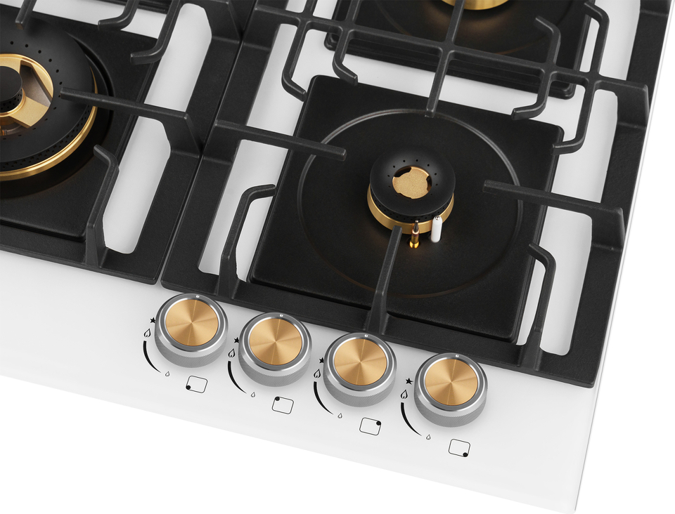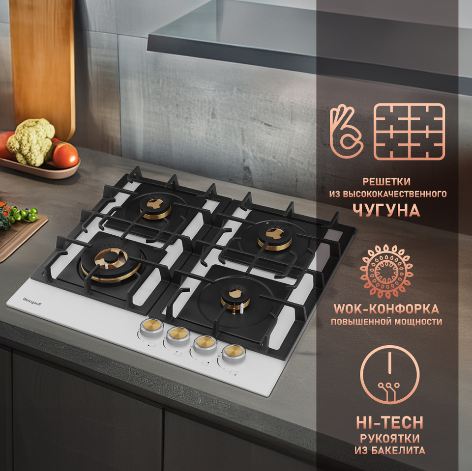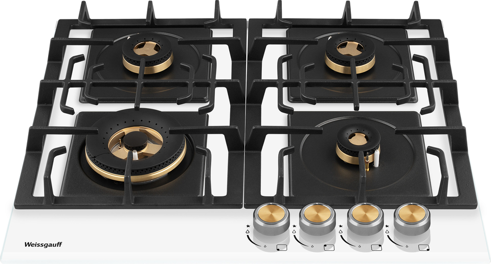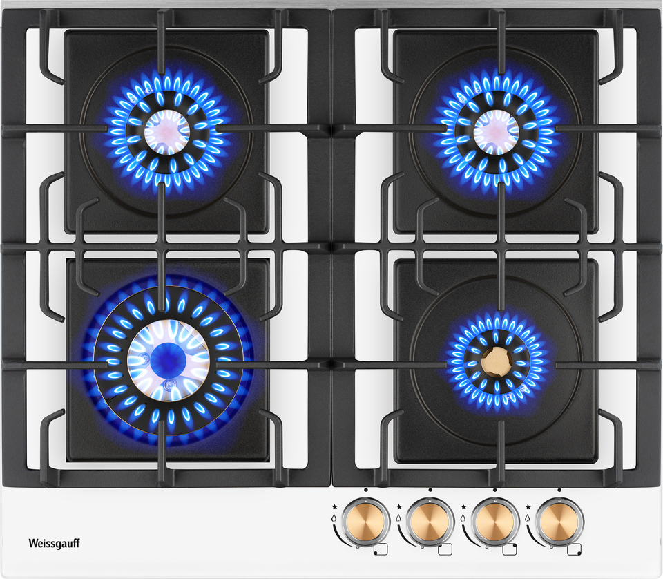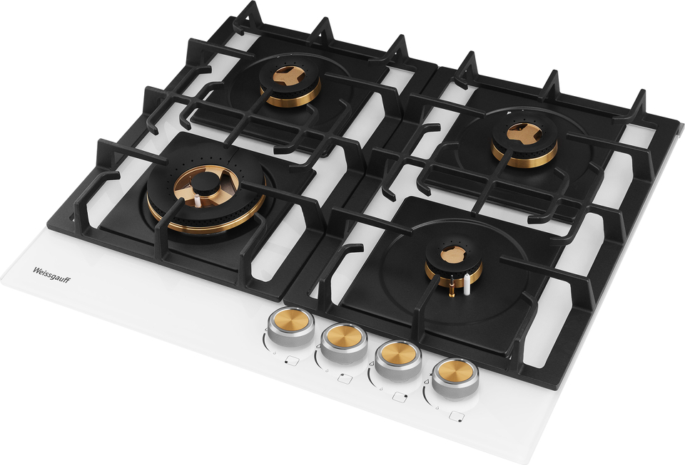 Встраиваемая независимая газовая панель Weissgauff шириной 60 см, оснащенная инновационной технологией конфорок Volcano Burner, бакелитовыми рукоятками, автоматическим электроподжигом и газ-контролем, исполненная в закалённом белом стекле - это по-настоящему эффективное и красивое решение для вашей кухни!