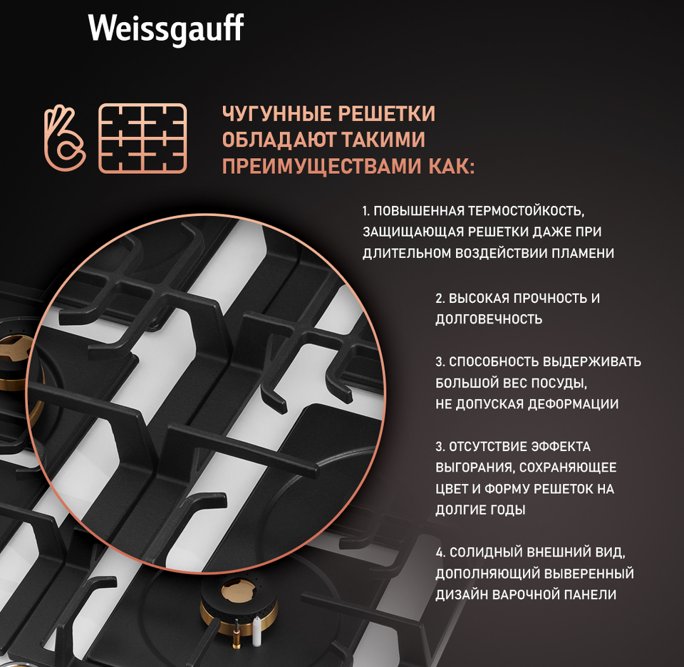 Решетки из высококачественного чугуна это неизменное качество, надежность и долговечность, воплощенные в каждой детали! Благодаря особому строению цельных решеток Weissgauff, размещение посуды на них становится ещё более удобным и устойчивым!