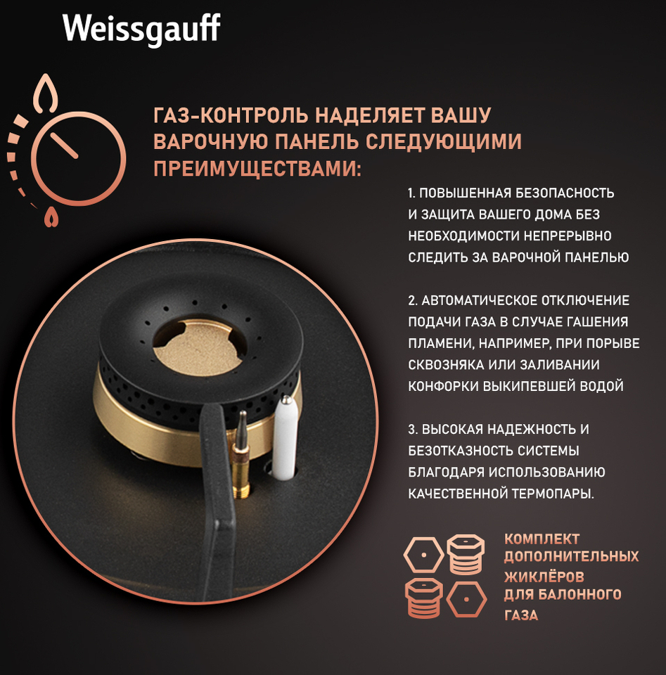 Газ-контроль каждой конфорки обеспечивает наивысшую безопасность: в случае, если пламя погасло, подача газа будет автоматически прекращена!