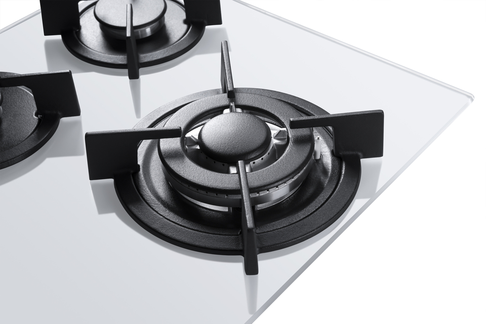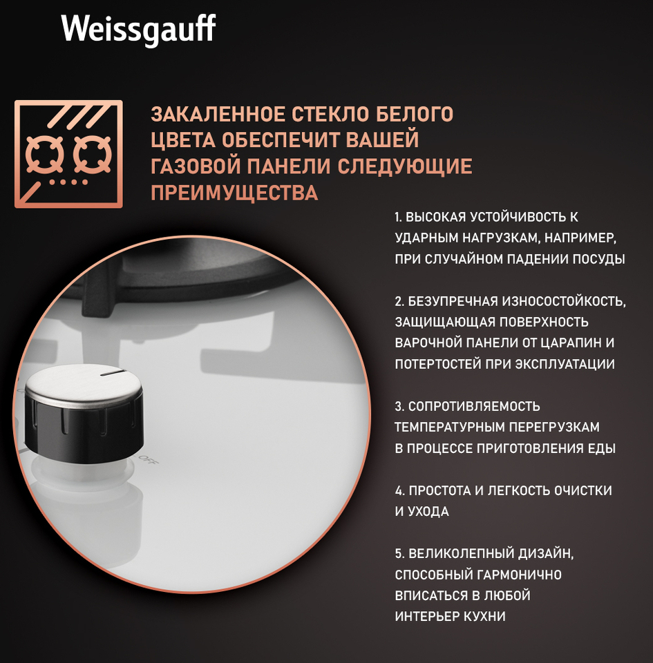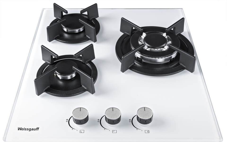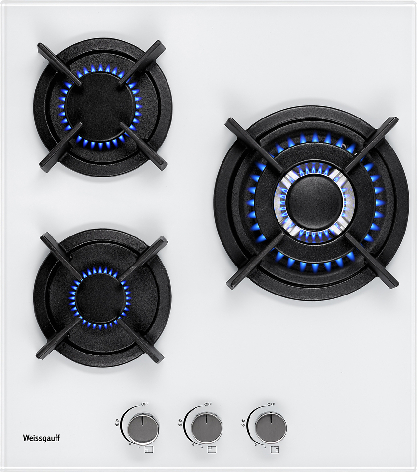 Встраиваемая независимая газовая панель Weissgauff шириной 45 см, исполненная в закалённом белом стекле - это стильное и компактное решение для вашей кухни!