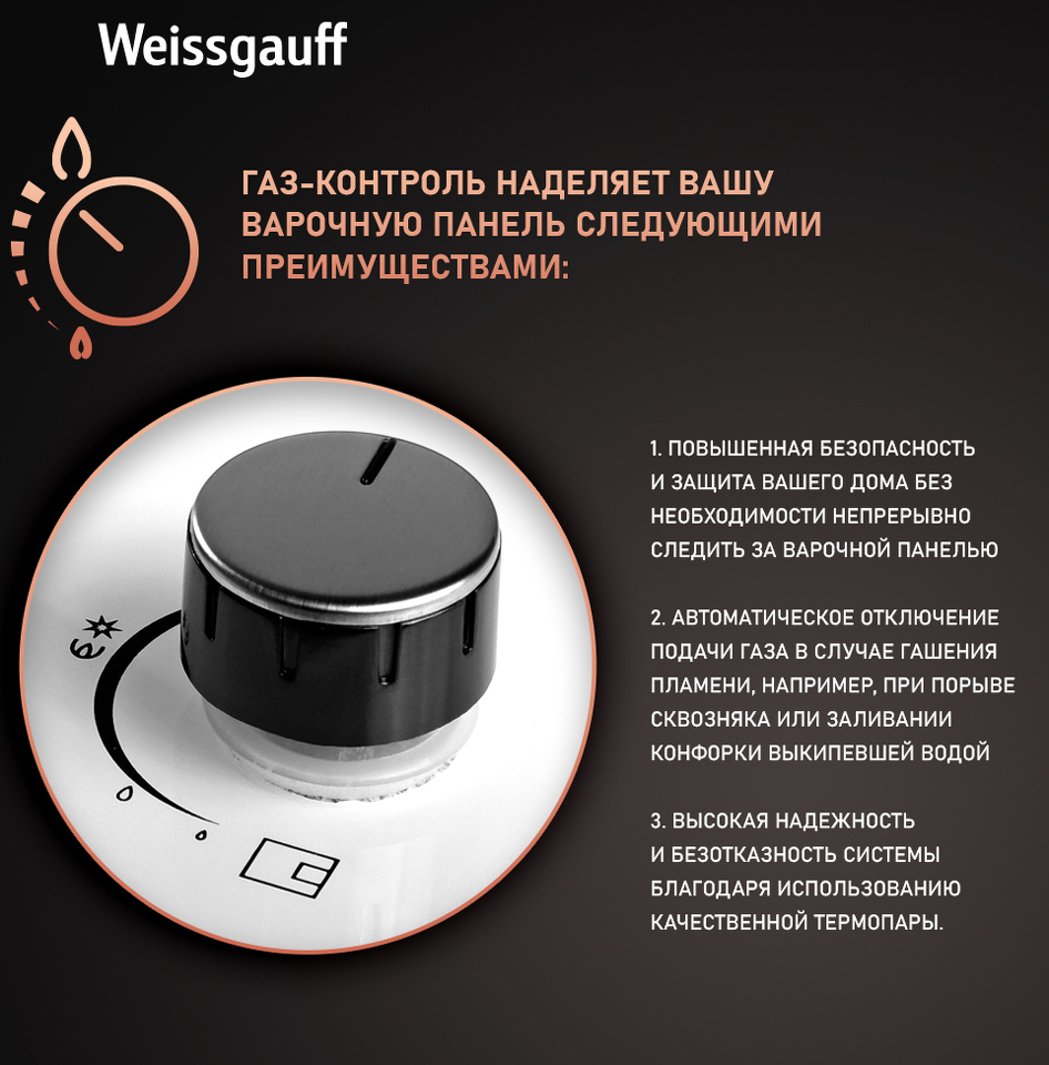 Газ-контроль каждой конфорки обеспечивает наивысшую безопасность: в случае, если пламя погасло, подача газа будет автоматически прекращена!