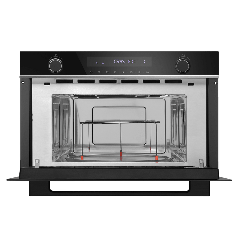 Встраиваемая микроволновая печь. Передняя панель выполнена из стекла. Свет зажигается при открытии дверцы. Настройка программ и таймера осуществляется при помощи сенсорного дисплея.