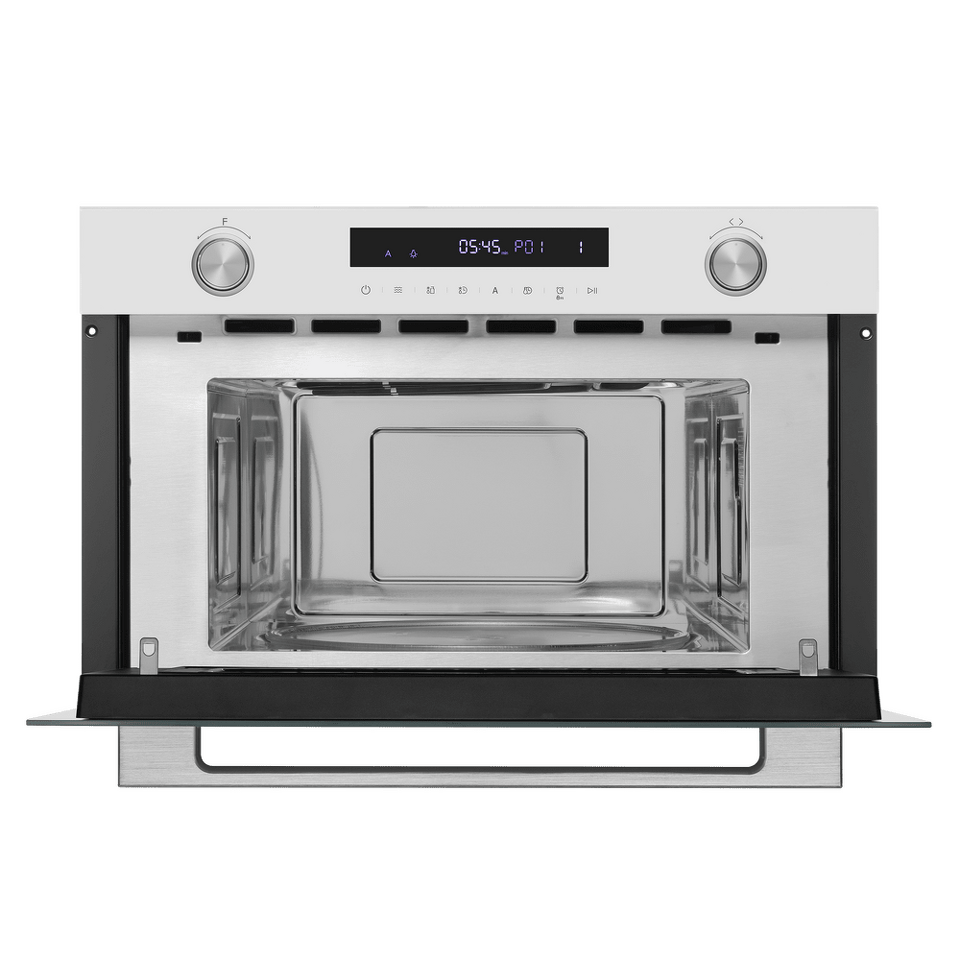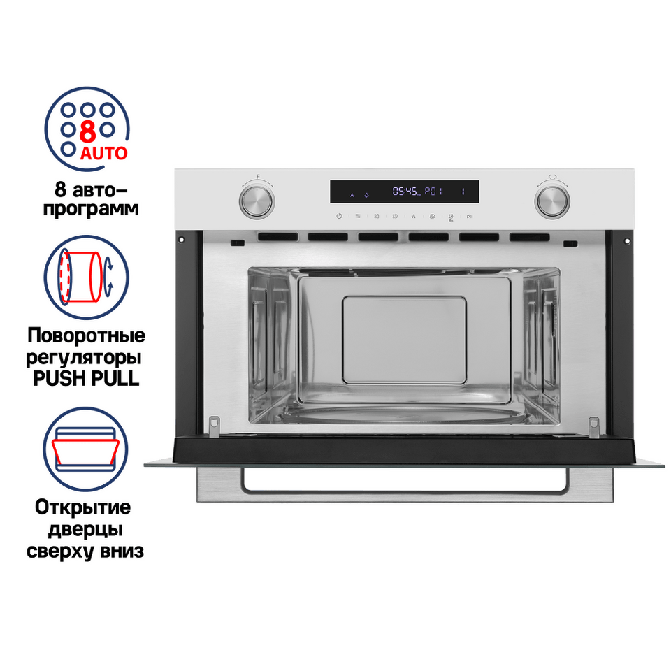 Встраиваемая микроволновая печь. Передняя панель выполнена из стекла. Свет зажигается при открытии дверцы. Настройка программ и таймера осуществляется при помощи сенсорного дисплея.