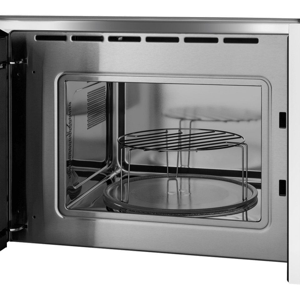 Размеры микроволновой печи делают ее компактной и удобной для встраивания в кухонный гарнитур. Вращающееся кольцо и стеклянный поддон обеспечивают удобство использования.