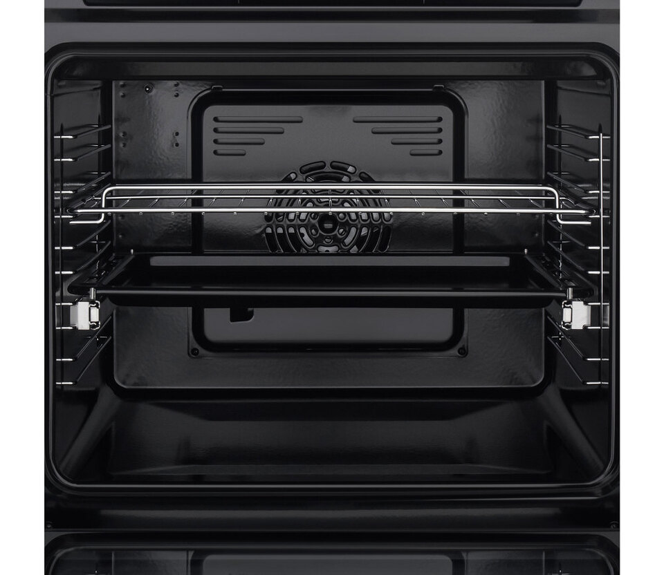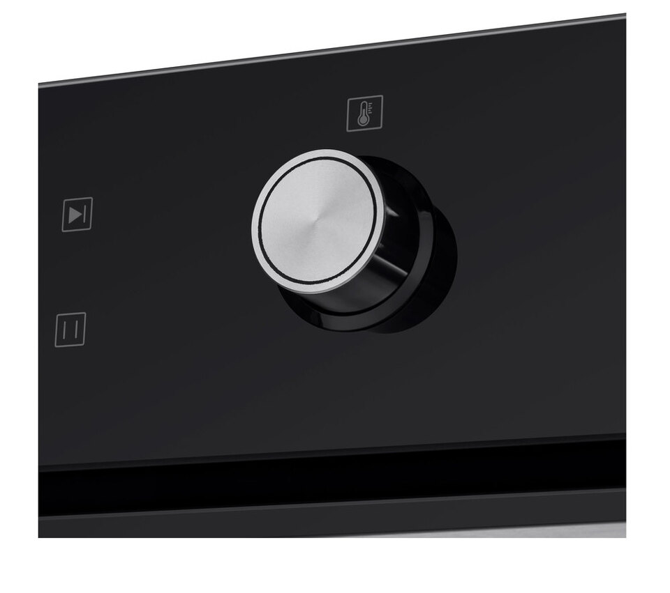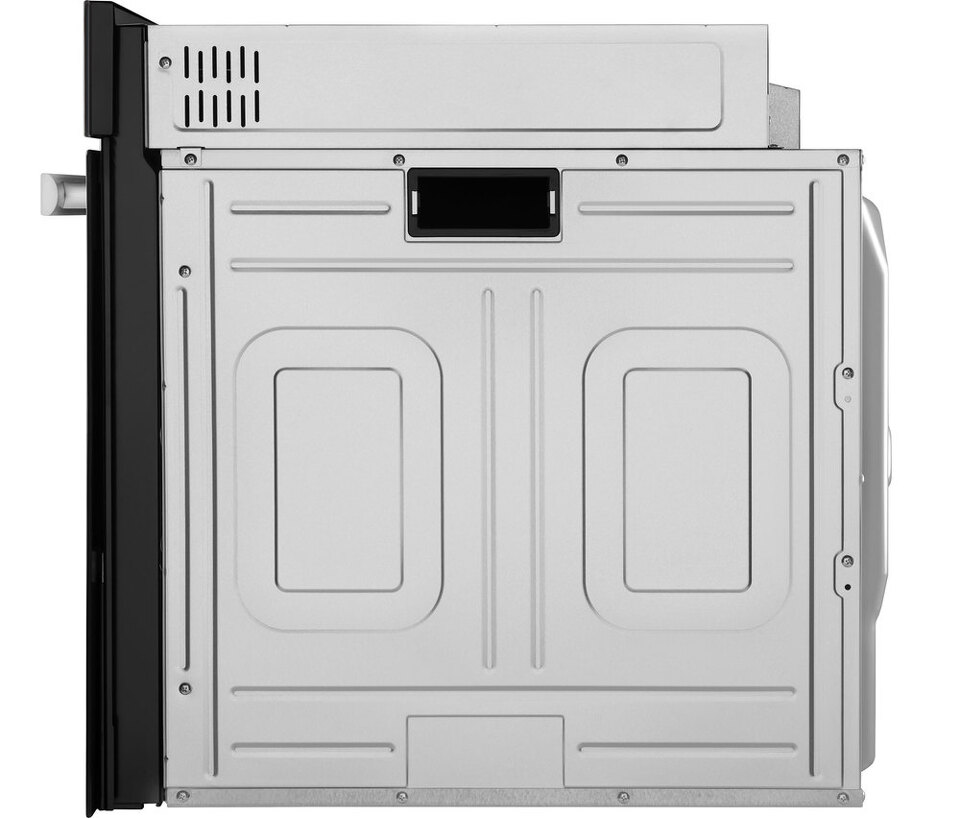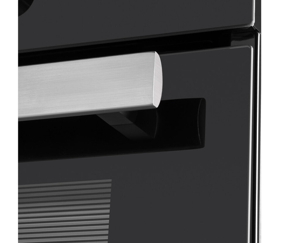 Фронтальная панель духовки выполнена из высококачественного жаропрочного тонированного стекла черного цвета. Ручка дверцы и ручки управления, сделанные из матированной нержавеющей стали, не нагреваются в процессе готовки.