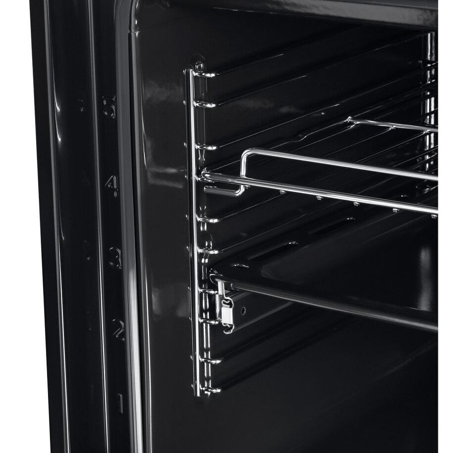 Объем 71 л при стандартной ширине 60 см позволяет готовить одновременно несколько блюд, разместив решетку или противень на одном из 6-ти уровней боковых направляющих. Одни из уровней оснащен удобными телескопическими направляющими. Внутреннее покрытие камеры выполнено из специальной легкоочищающейся эмали черного цвета.