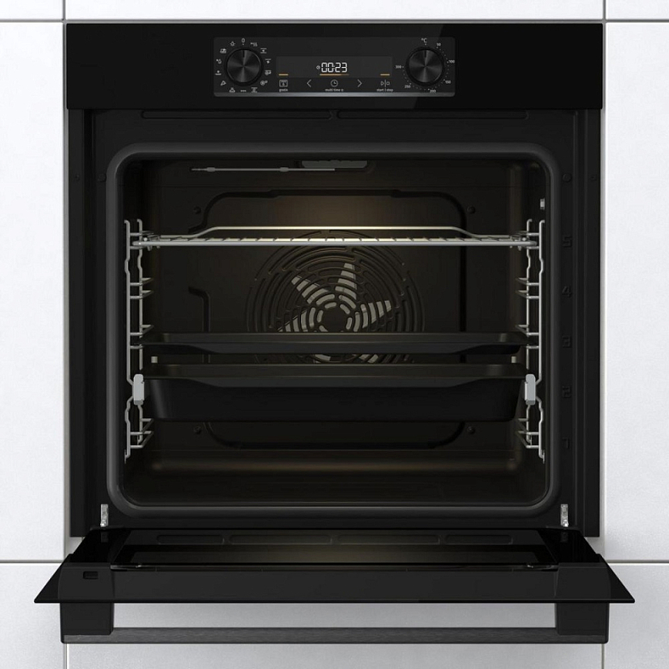 Независимая духовка Gorenje BOS6737E06FBG — великолепная модель черного цвета, обладающая огромным функционалом и большой вместительностью, благодаря чему в ней можно готовить крупные куски мяса, птицу целиком, а так же несколько блюд на разных уровнях одновременно. При этом сводчатая конструкция потолка камеры HomeMade создает эффект приготовления в дровяной печи, благодаря свободной циркуляции воздуха и равномерному прогреву со всех сторон при помощи опции вариогриль PerfectGrill.