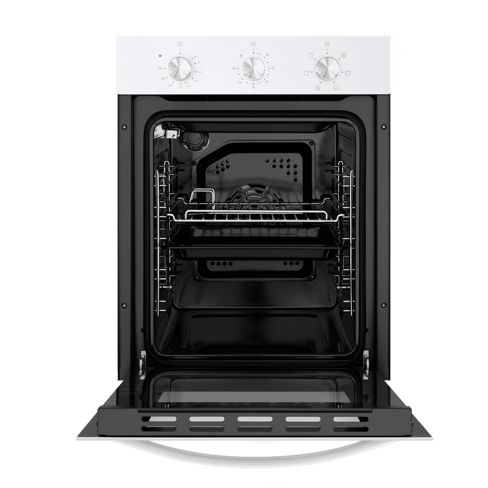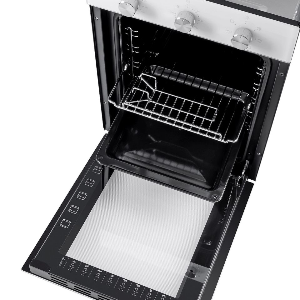 Фронтальная панель духовки сделана из высококачественного жаропрочного тонированного стекла белого цвета. Цельнометаллическая ручка дверцы и ручки управления остаются холодными в процессе готовки.