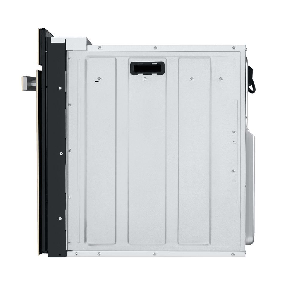Фронтальная панель духовки и фасад ручки дверцы сделаны из высококачественного жаропрочного стекла бежевого цвета, окрашенного по всему объему, что является отличительной чертой бытового прибора премиум-класса.