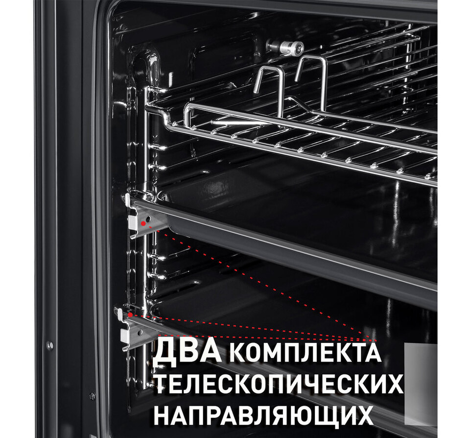 Объем 76 л при стандартной ширине 60 см позволяет готовить одновременно несколько блюд, разместив решетку или противень на одном из 6-ти уровней боковых направляющих. Два уровня оснащены удобными телескопическими направляющими. Внутреннее покрытие камеры выполнено из специальной легкоочищающейся эмали черного цвета.