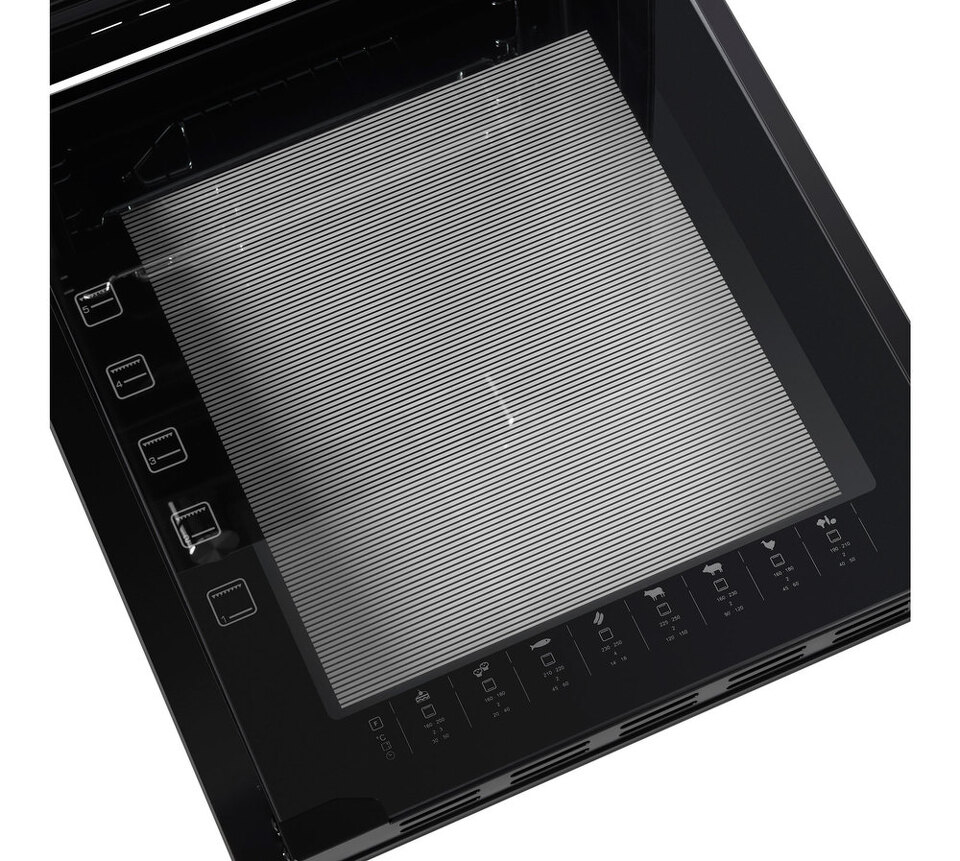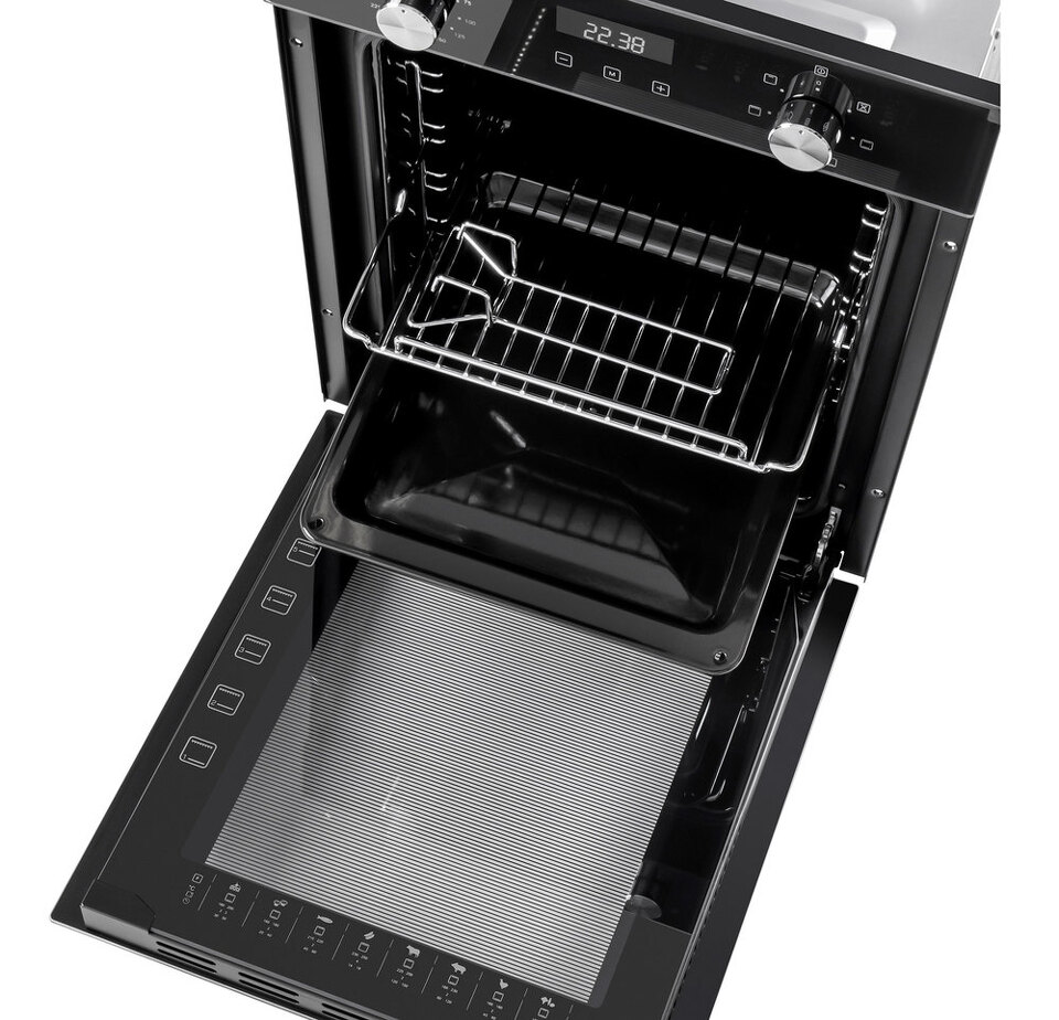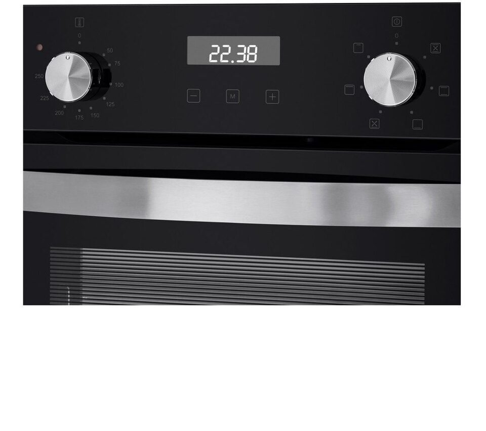Комбинированное управление реализовано с помощью сенсорного дисплея и цельнометаллических поворотных ручек. Можно установить таймер, выбрать температуру (50°-250°C) и один из 7-ми режимов работы: внутреннее освещение, традиционный нагрев, большой гриль, конвекция с нижним нагревом, нижний нагрев, конвекционный нагрев, малый гриль.