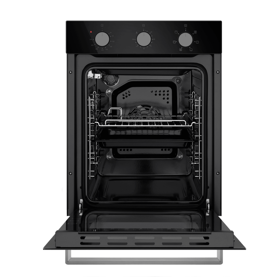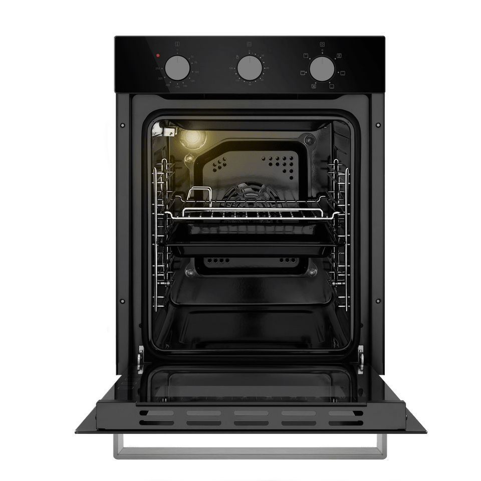 Механическое управление работой духовки осуществляется утапливаемыми поворотными ручками. Можно установить таймер (до 120 мин), выбрать температуру (50°-250°C) и один из 7-ми режимов работы: внутреннее освещение, традиционный нагрев, большой гриль, конвекция с нижним нагревом, нижний нагрев, конвекционный нагрев, малый гриль.