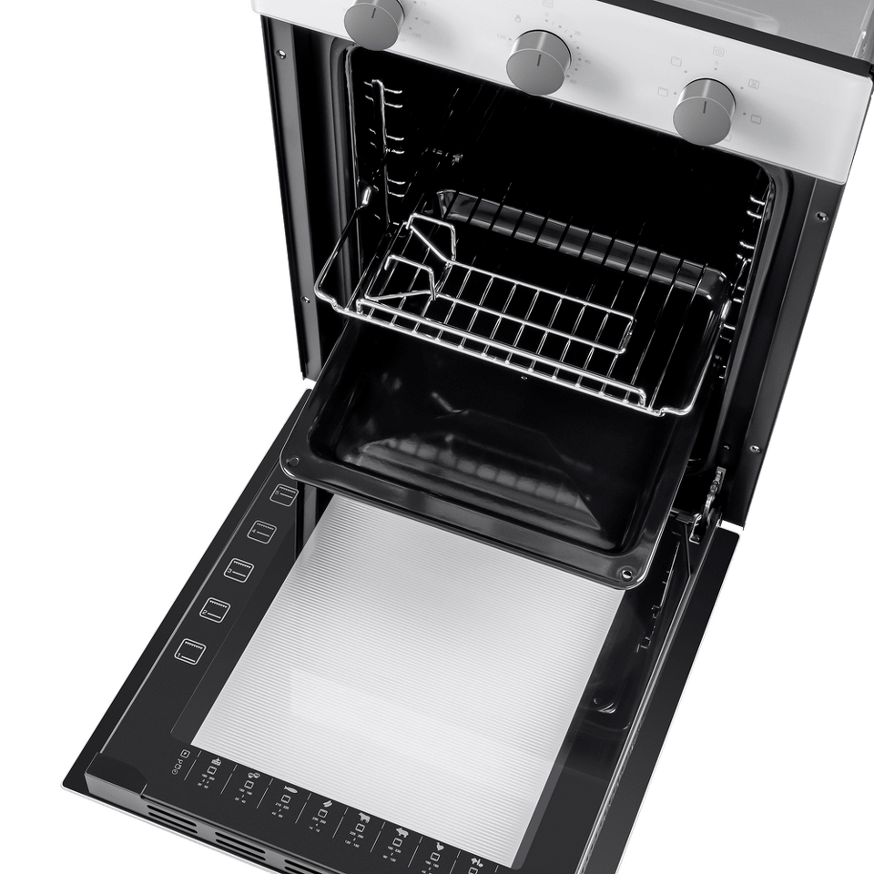 Механическое управление работой духовки осуществляется утапливаемыми поворотными ручками. Можно установить таймер (до 120 мин), выбрать температуру (50°-250°C) и один из 6 режимов работы: традиционный нагрев, большой гриль, конвекция с нижним нагревом, нижний нагрев, конвекционный нагрев, малый гриль.