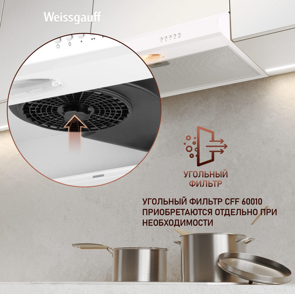 • Работа в режимах отвода и циркуляции откроет вам широкие возможности по установке этой вытяжки в проект вашей кухни. Организуйте полноценный вывод воздуха из помещения или установите угольный фильтр и используйте вытяжку вместе с ним - какой бы вариант вы ни выбрали, модель от Weissgauff сделает это возможным!