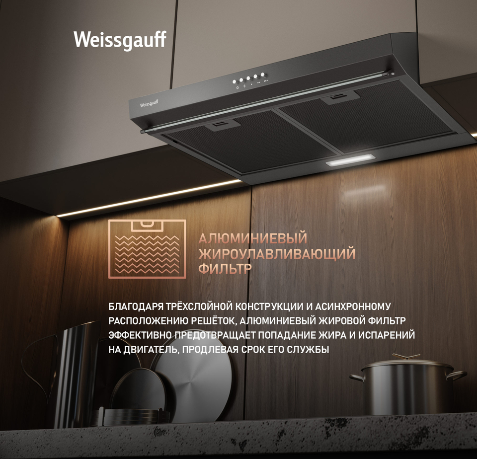 Плоская кухонная вытяжка от Weissgauff, воплощающая в себе безупречный дизайн и высокую эффективность, оснащена интуитивно понятным кнопочным управлением и выполнена в дизайне черного цвета!