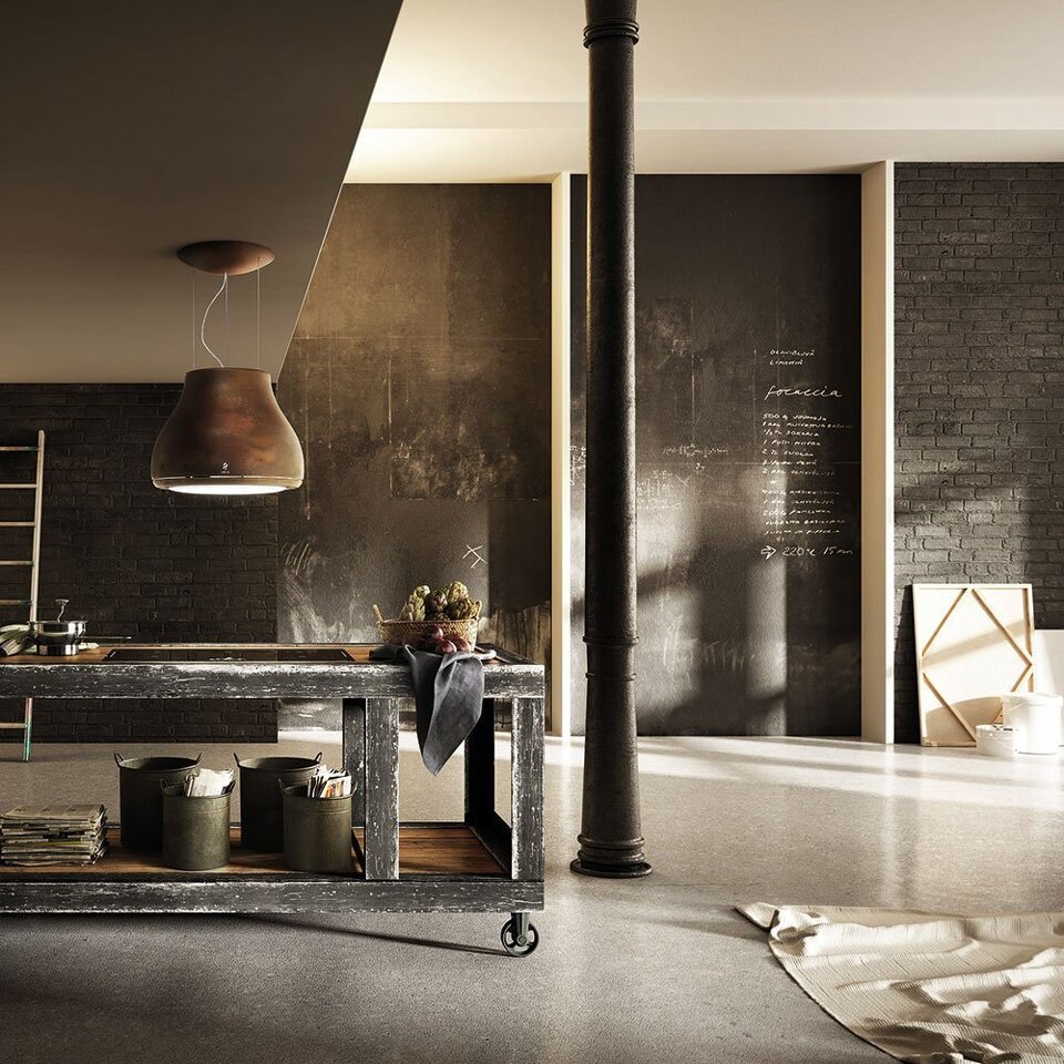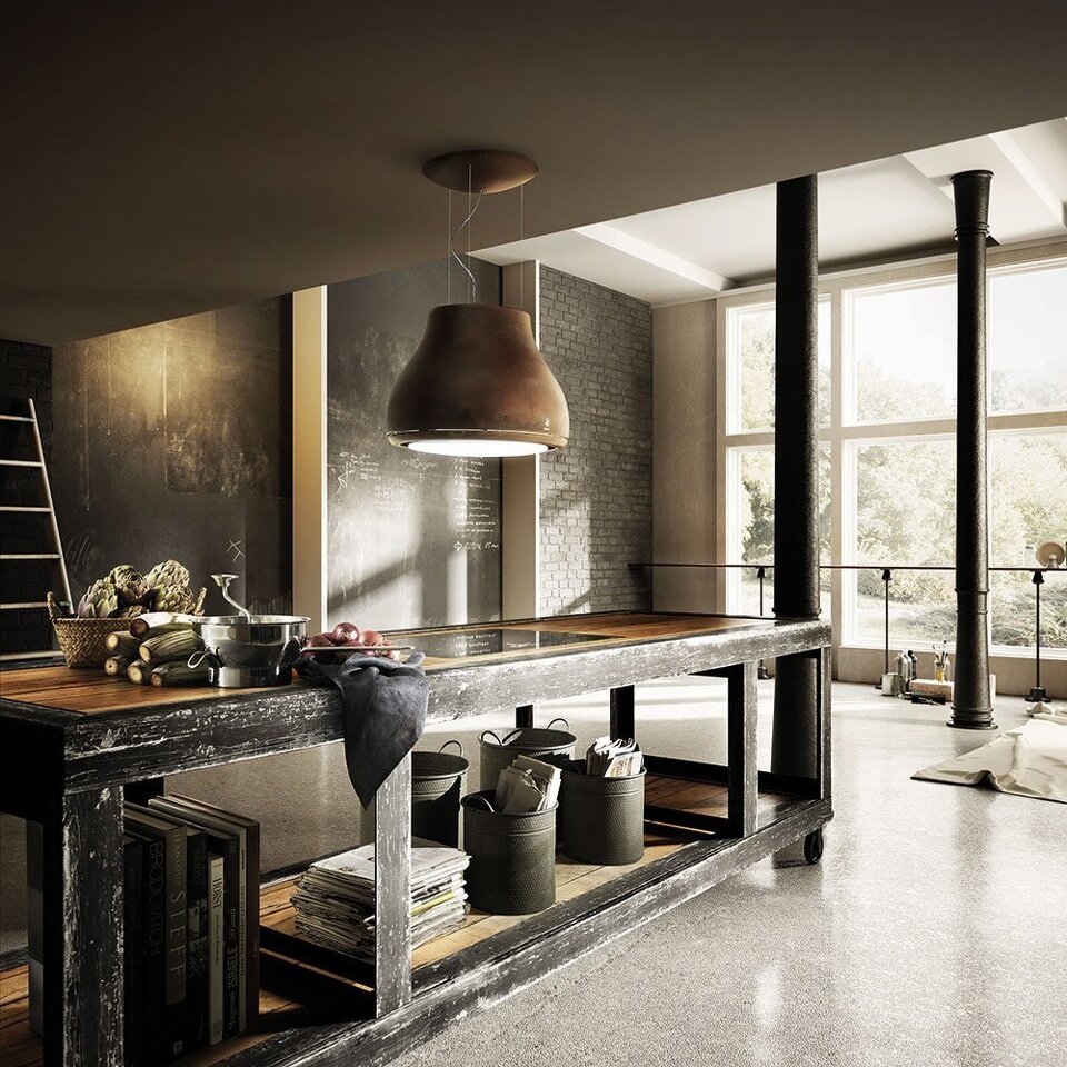 Дизайн. Подвесная вытяжка-люстра ELICA SHINING RUST/F/50 выполнена в цвете «состаренная медь». Модель великолепно вписывается как в классический, так и в современный интерьер в стиле хай-тек или лофт. На нижней кромке расположена панель управления, все функции которой включаются и с пульта ДУ. Потолочный монтаж позволяет повесить вытяжку над кухонным островом, но также существует возможность установки на стену.