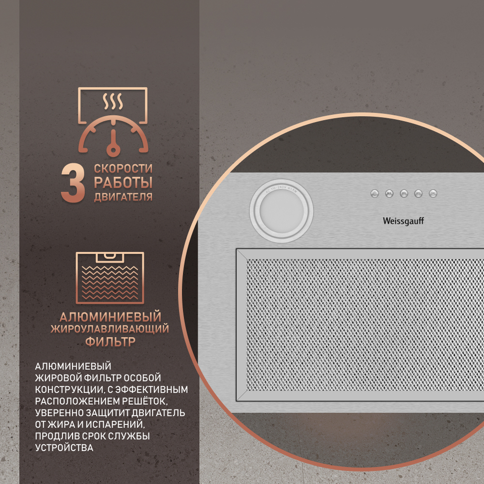 Алюминиевый жировой фильтр особой трёхслойной конструкции, с асинхронным расположением решёток, эффективно защитит двигатель от жира и испарений, продлив срок службы устройства.