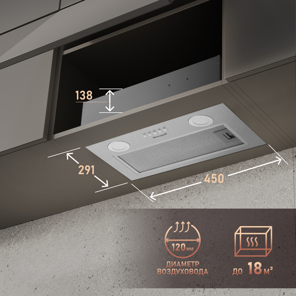 Впечатляющая производительность 450 м3/ч позволит эффективно и бескомпромиссно справиться с задачей по очистке воздуха на вашей кухне!