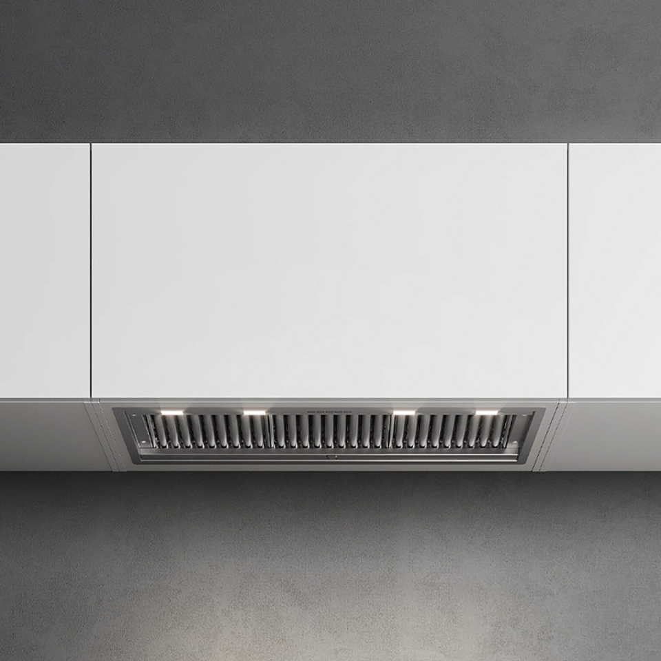 Дизайн. Вытяжка Falmec Gruppo Incasso No-Drop имеет корпус из нержавеющей стали. От моделей предыдущего поколения отличается тем, что корпус полностью примыкает к нижней части шкафа.