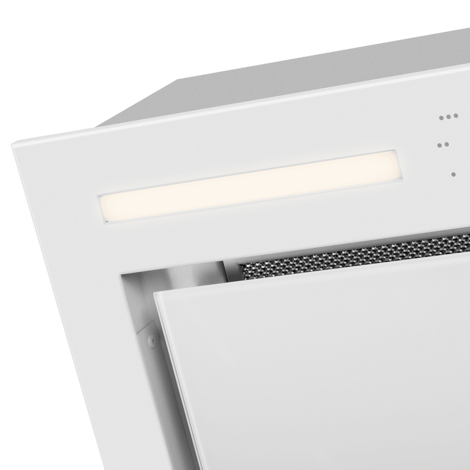 Элегантная встраиваемая вытяжка шириной 60 см предназначена для очистки воздуха в очень больших помещениях. Откидной фасад из закаленного стекла.